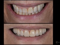 Para mejorar esta asimetría, en una primera etapa se procedió a igualar los bordes gingivales mediante una pequeña intervención periodontal. Seguidamente se procedió a realizar reconstrucciones estéticas para recuperar el esmalte perdido por el desgaste y restablecer la forma dental. Finalmente se procedió a cambiar las coronas sobre diente y implantes en el lado izquierdo.