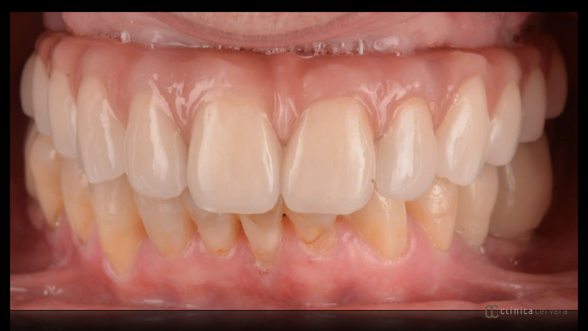 En la parte inferior se han restaurado las piezas remanentes con composite (esmalte sintético) y se han colocado implantes y prótesis cerámicas en los molares ausentes.