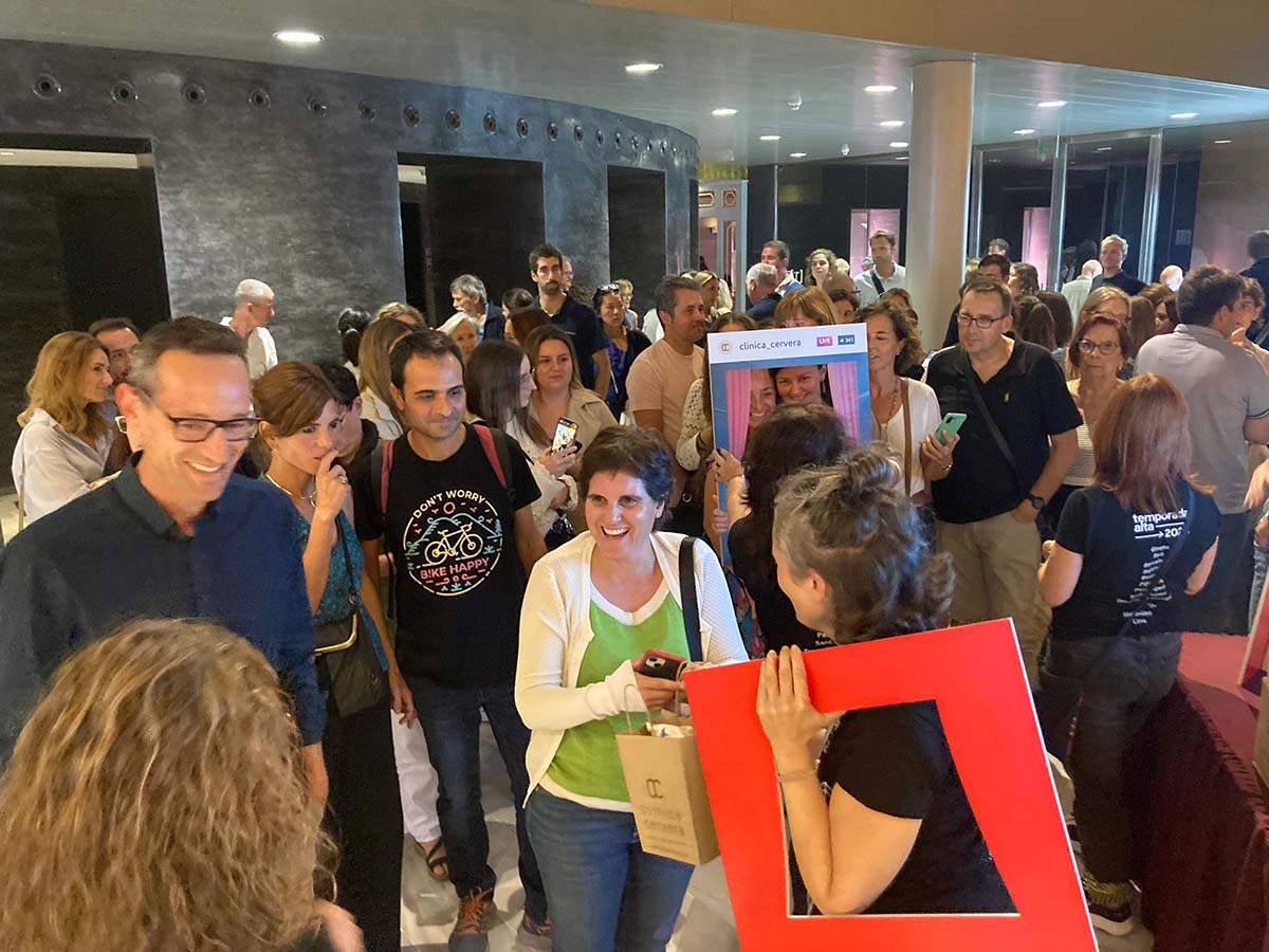 Y precisamente por eso, porque además de espectadores y apasionados, nos encanta ser patrocinadores de nuestra cultura, preparamos una pequeña sorpresa para todos los asistentes a la salida de la obra. Allí colocamos un proyector en el que se visualizaban algunas imágenes del día a día de Clínica Cervera, se regalaron kits de higiene dental con vales para una consulta de ortodoncia sin coste y la participación en el sorteo para un tratamiento de blanqueamiento dental gratuito. Además, tres voluntarias del festival se encargaron de animar a los asistentes a que se hicieran fotos con el photocall diseñado para la ocasión. Así todos pudieron compartir sus fotos en redes sociales y llevarse a casa un buen recuerdo.